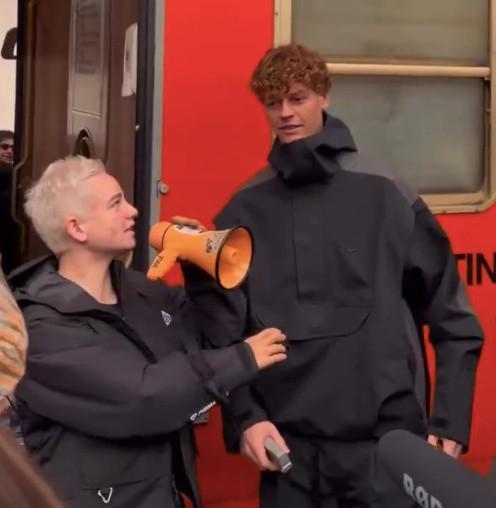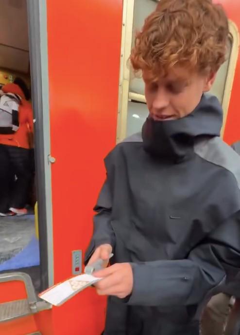 视频中,辛纳扮演起了火车查票员的角色,正在查验一名乘客的车票。